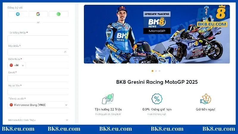 Với quy trình đăng ký BK8 đơn giản và nhanh chóng, bạn chỉ cần vài phút để mở tài khoản và bắt đầu cá cược từ hôm nay Hãy tận dụng những ưu đãi và dịch vụ chăm sóc khách hàng chuyên nghiệp để có những trải nghiệm tuyệt vời tại nhà cái.